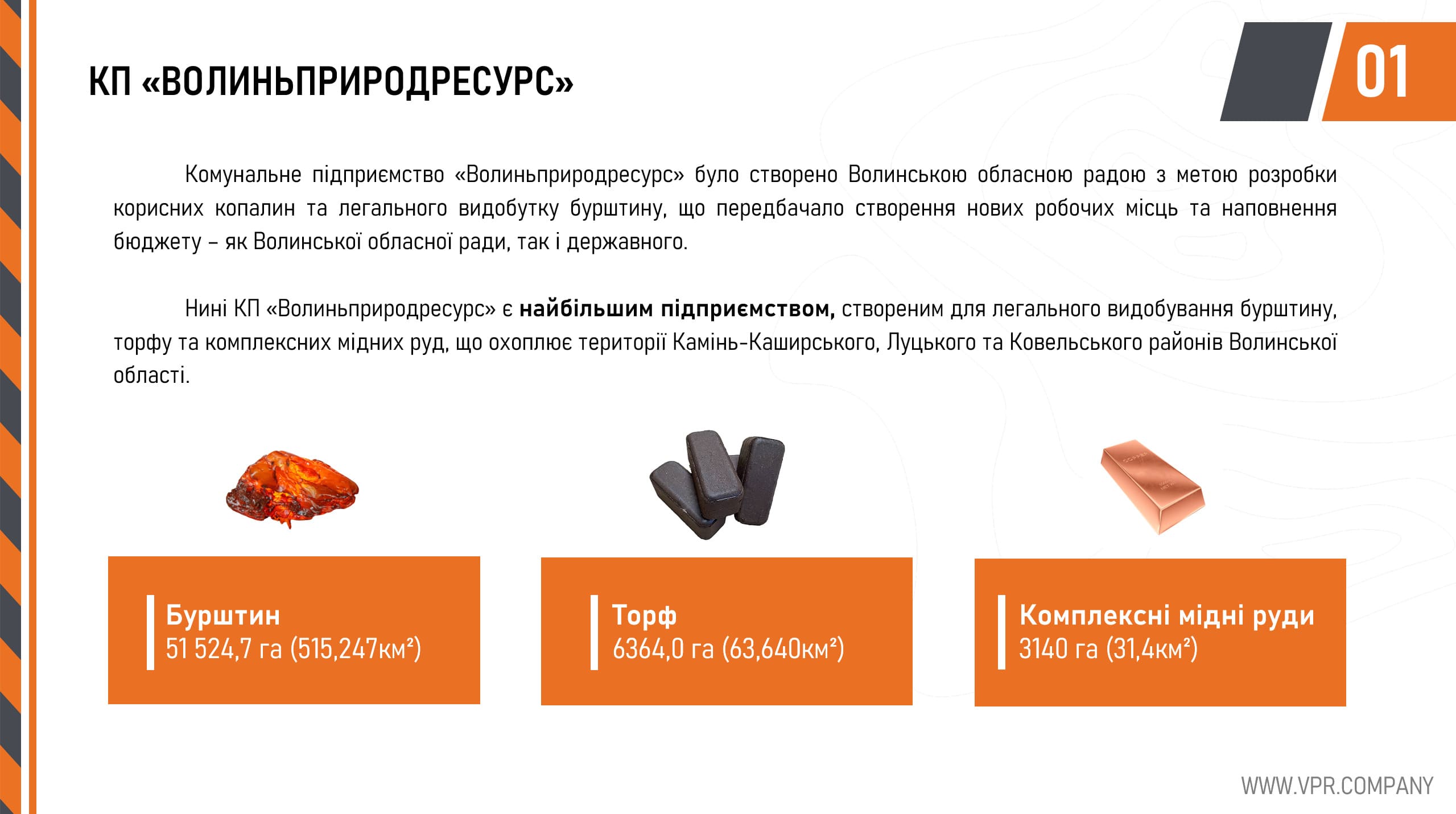 “Our enterprise is one of the largest mining companies in Ukraine, not to mention municipal ones. It has four special permits for amber extraction covering a licensed area of 51,524 hectares; four special permits for peat extraction covering a licensed area of 6,364 hectares; and one special permit for copper ore extraction covering a licensed area of 3,140 hectares.
