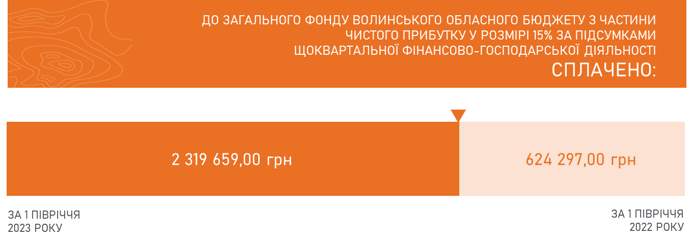 До загального фонду Волинського обласного бюджету з частини чистого прибутку у розмірі 15% за підсумками щоквартальної фінансово-господарської діяльності за І півріччя 2023 року сплачено 2 319 659.00 грн. Порівнюючи з підсумками щоквартальної фінансово-господарської діяльності за І півріччя 2022 року, коли до загального фонду Волинського обласного бюджету з частини чистого прибутку у розмірі 15% сплачено 624 297,00 грн, помітно, що на початок 2023 року припадають значно вищі показники видобутку.