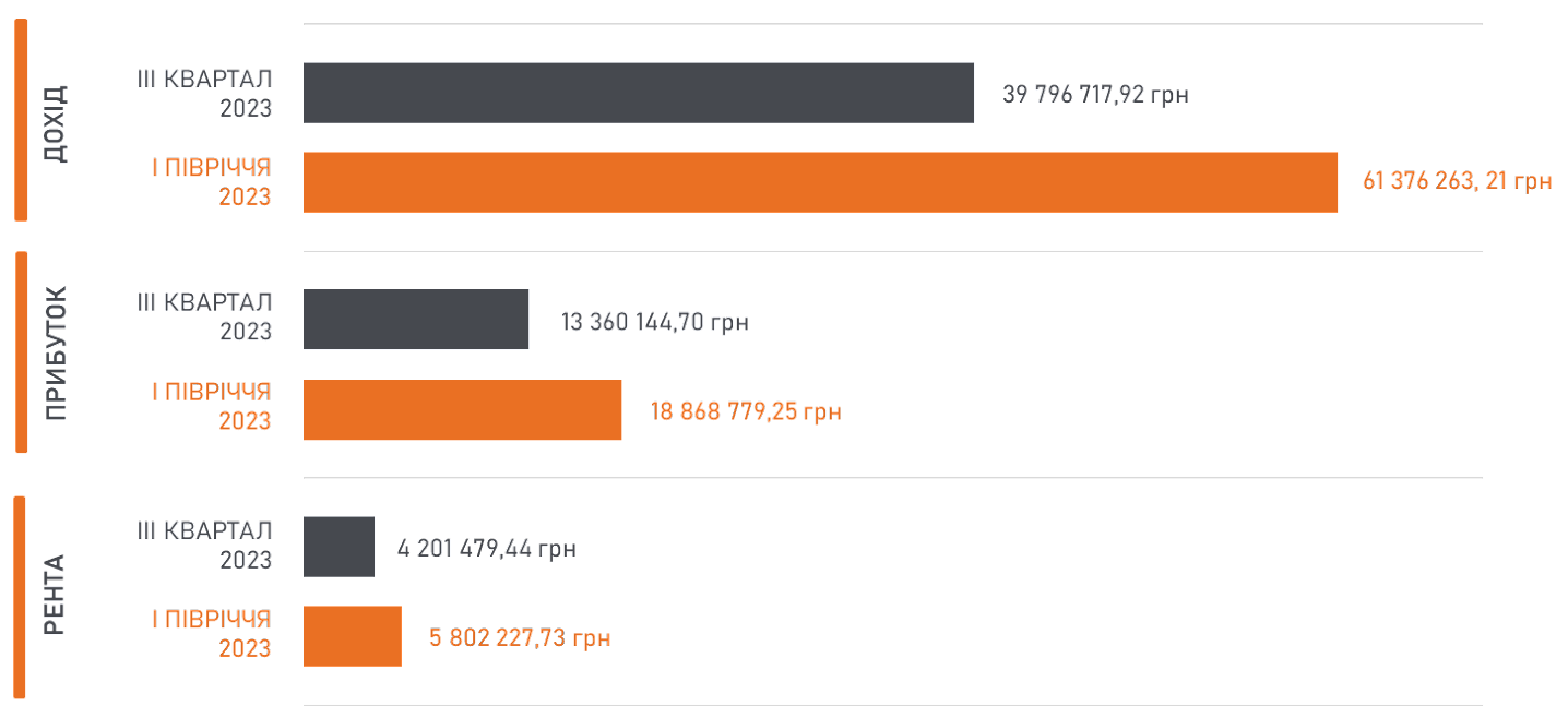 У ІІІ кварталі 2023 року КП «Волиньприродресурс» Волинської обласної ради продовжило успішний видобуток бурштину та торфу, тому показники фінансово-господарської діяльності  надаємо  у  тому  числі в розрізі  виконання  договору  спільної  діяльності  з  ТОВ «Надровидобування» та договору з ДП «Волиньторф».