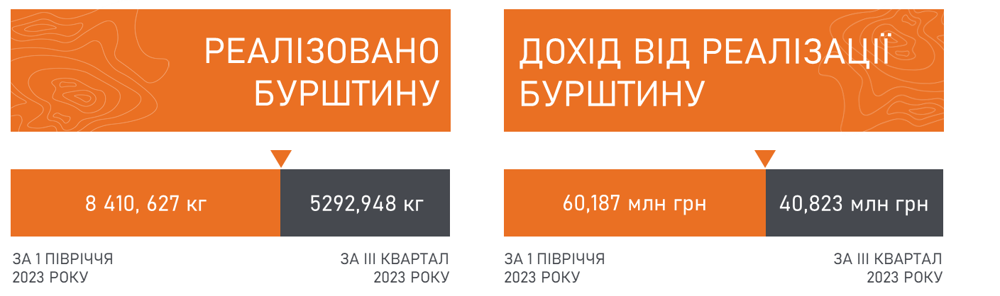 Комунальне підприємство «Волиньприродоресурс» у розрізі виконання договору спільної діяльності з ТОВ «Надровидобування» за І півріччя  2023 року  видобуло  –  7 677, 713 кг бурштину різних фракцій та груп якості, реалізовано – 8 410, 627 кг на загальну суму – 60,187 млн грн.  За ІІІ квартал 2023 року видобуто 5022,148 кг бурштину, реалізовано – 5292,948 кг бурштину на суму 40 823 616,47 грн, залишок бурштину на складі становить 920,019 кг.