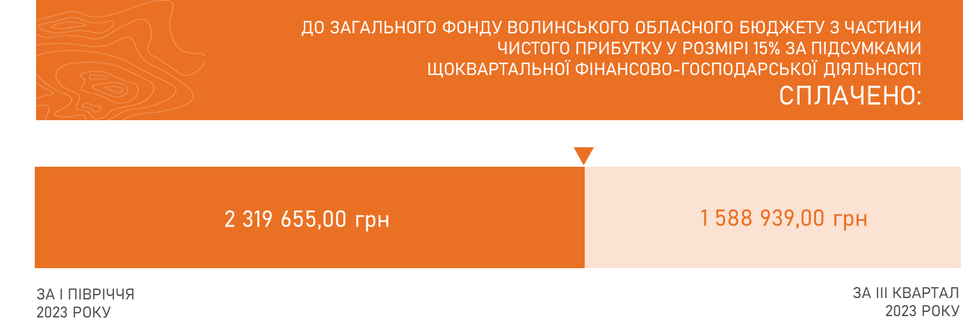 До загального фонду Волинського обласного бюджету з частини чистого прибутку у розмірі 15% за підсумками щоквартальної фінансово-господарської діяльності за І півріччя 2023 року сплачено 2 319 655,00 грн.